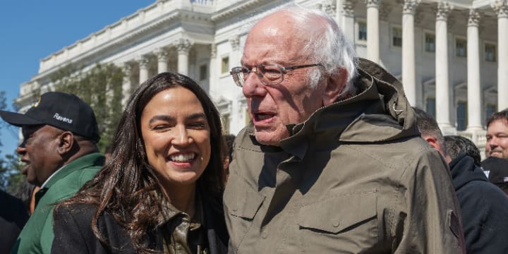 US Sen. Bernie Sanders (I-VT) and US Rep. Alexandria Ocasio-Cortez (D-NY) are seen before a press conference on Capitol Hill in Washington, DC, on March 21, 2024. Photo: Craig Hudson/Sipa USA via Reuters Connect